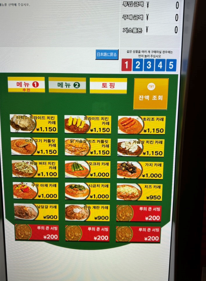 히노야 카레에는 입구에 키오스크가 있고, 한글지원도 되기 때문에 편하게 주문을 하실 수가 있어요!