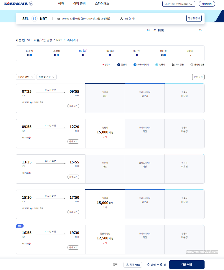 그리고 마일리지 예매의 경우, 결제하는 항공좌석에 비해서 수량이 적어