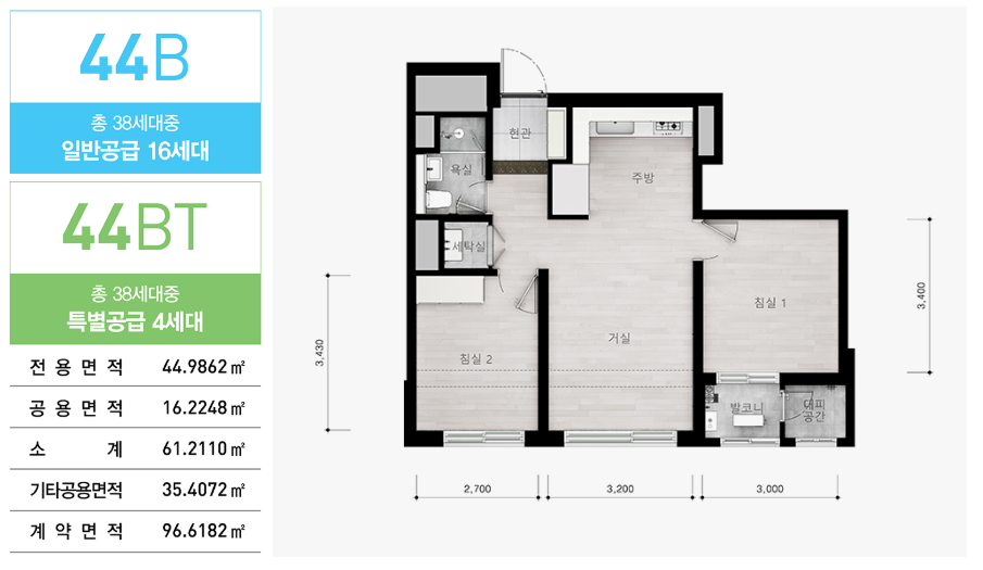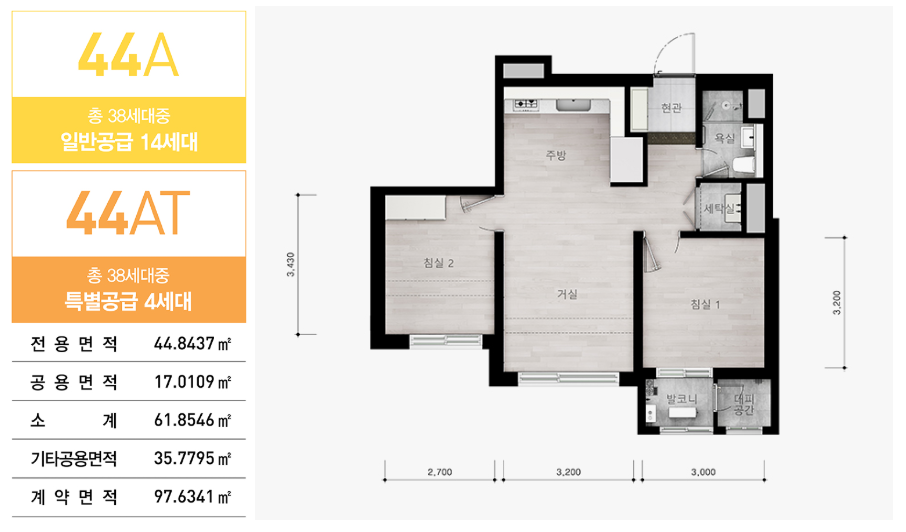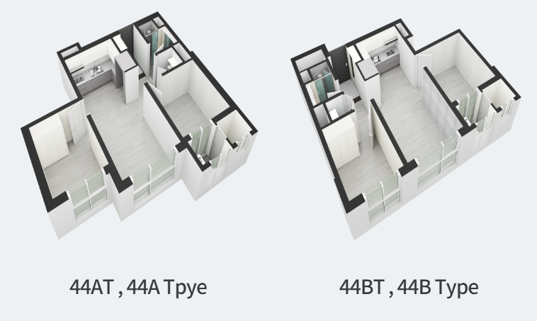 44A, 44B 두 가지 타입의 평면도를 제공하며, 각각 방이 두 개, 욕실, 세탁실, 발코니로 구성되어 있습니다.